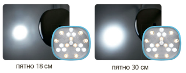 Путем поворота центрального рычага можно менять размер светового пятна с 18 см до 30 см.