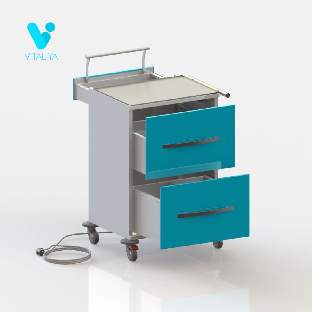 Стойка с тремя ящиками, два из которых оснащены разделительными стенками. На правой стенке стойки расположены две ручки и одна розетка на два гнезда со шторками. От розеток идёт кабель длиной 2,5 метра. Стойка установлена на колёсные опоры диаметром 125мм, два колеса с тормозом. Колёса оснащены бамперами.