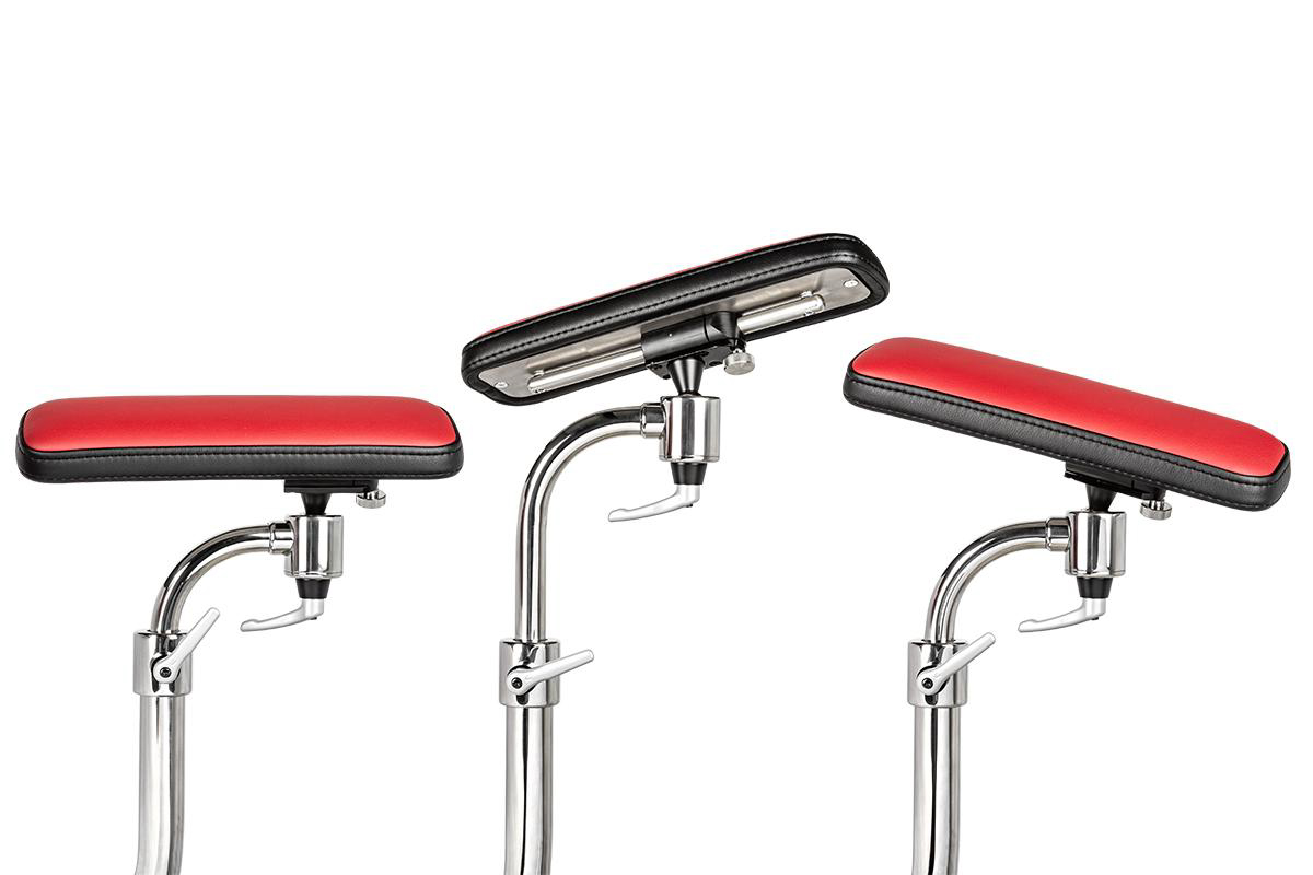 Подлокотники стула имеют очень широкий диапазон регулировки, что позволяет работать с микроскопом с максимальным комфортом. Функция трёхмерной регулировки позволит выставить необходимое положение подлокотников по высоте, горизонтали, а также по кругу. Также подлокотники могут выезжать вперёд.