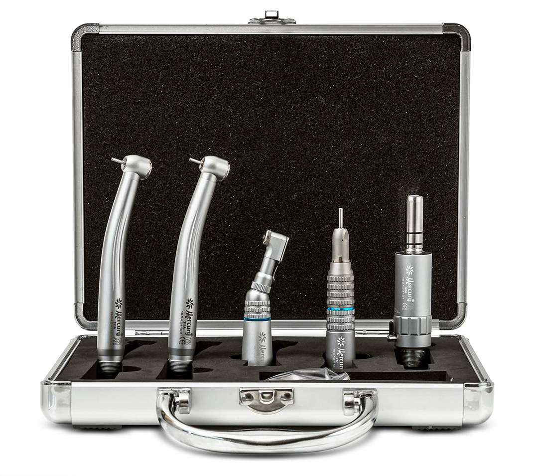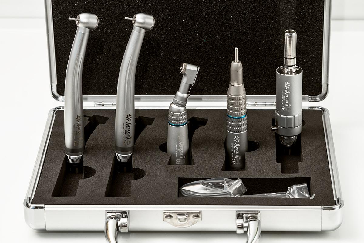 В наборе 2 кнопочных турбинных наконечника, воздушный микромотор, угловой и прямой наконечники.