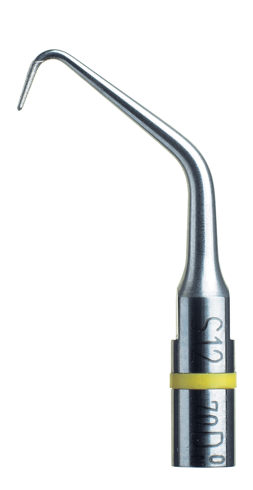 Насадка для скайлера S12-70D, для минимально инвазивной апикальной хирургии в области любых премоляров и моляров, насадка под углом 700, с алмазным покрытием 30мкм, конусность 9%. Удлинённая рабочая часть кончика насадки, 5мм. Используется при необходимости ретроградного закрытия канала цементом, при полностью пройденном канале традиционным эндодонтическим способом. Ретроградная распломбировка канала такими насадками показана при невозможности прохождения канала в виду наличия в нём индивидуальной литой корневой вкладки, при фиксации на зубе протяжённой ортопедической конструкции. Этот метод позволяет сохранить ортопедическую конструкцию интактной. При полной ревизии корневого канала и резекции верхушки корня вместе с инфицированной дельтой корневого канала, ретроградная пломбировка с применением ультразвуковых насадок для апикальной хирургии позволяет достичь наилучших долгосрочных результатов.
