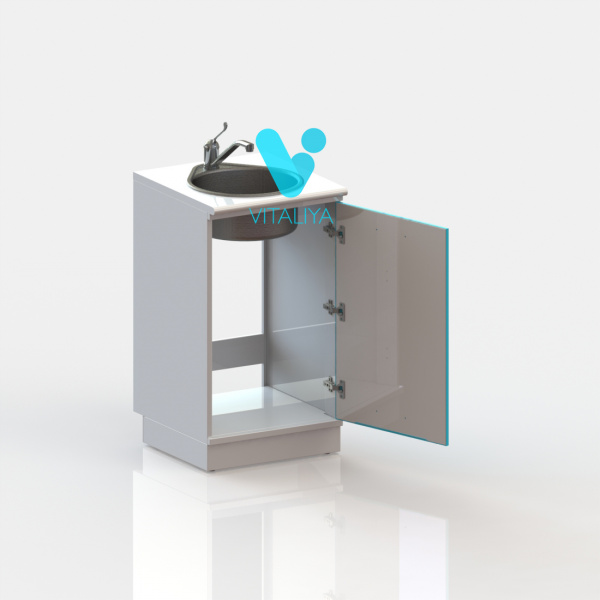 Тумба с дверцей, с вырезом в задней стенке для подвода коммуникаций, оснащена мойкой из нержавеющей стали, локтевым смесителем, сифоном.