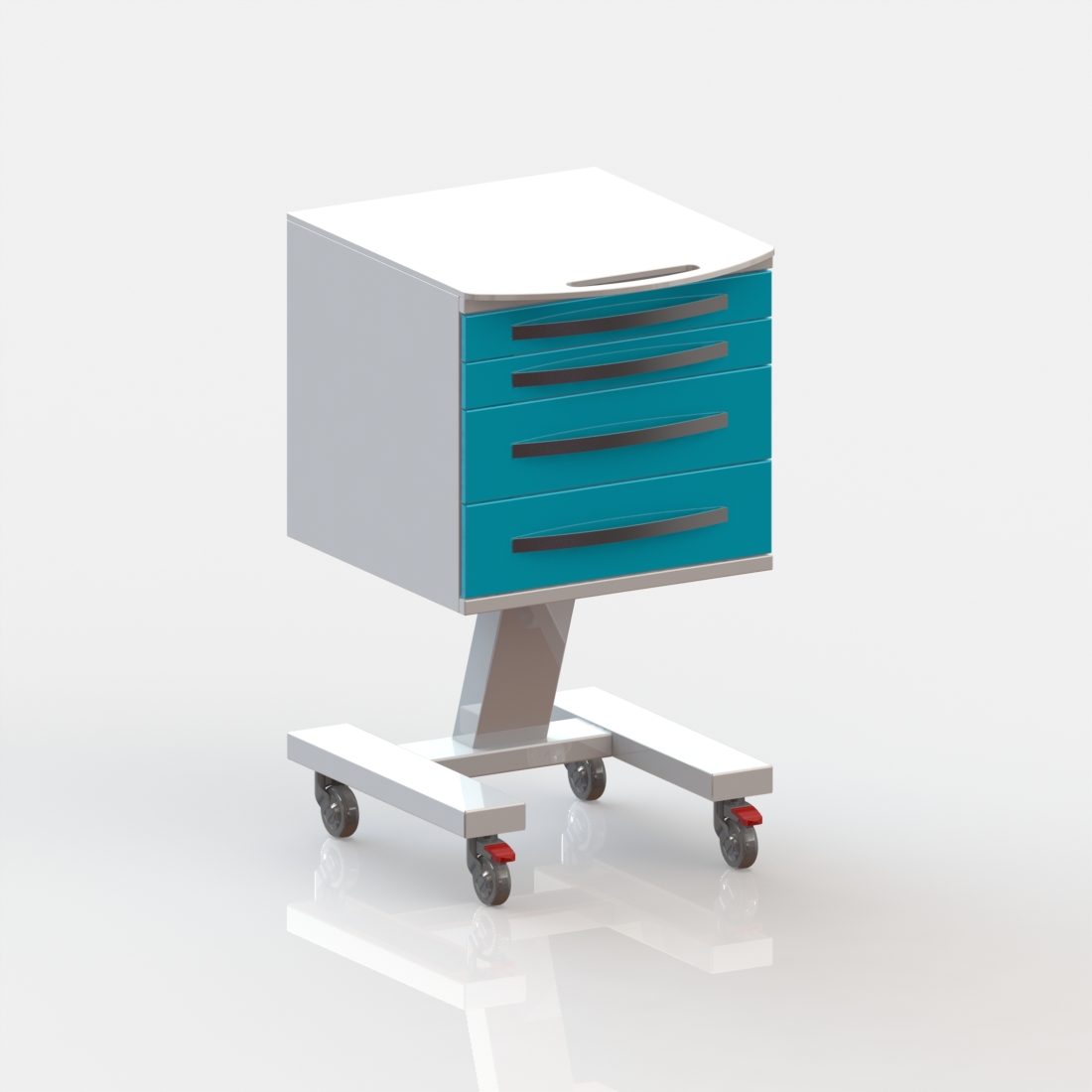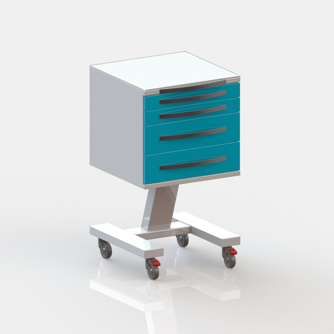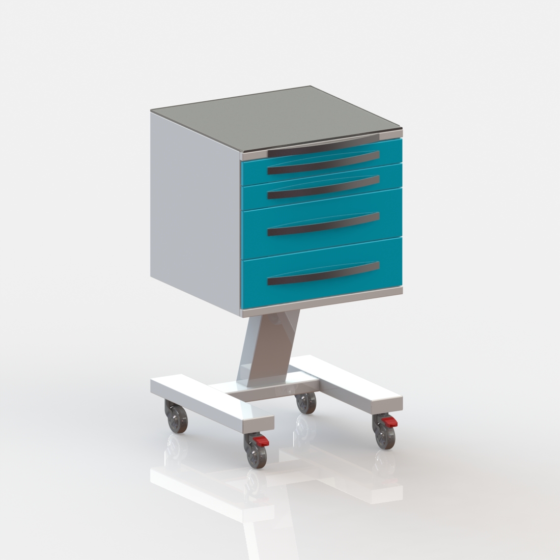 4 выдвижных ящика. Колёса 50 мм, 2 колеса с тормозом.