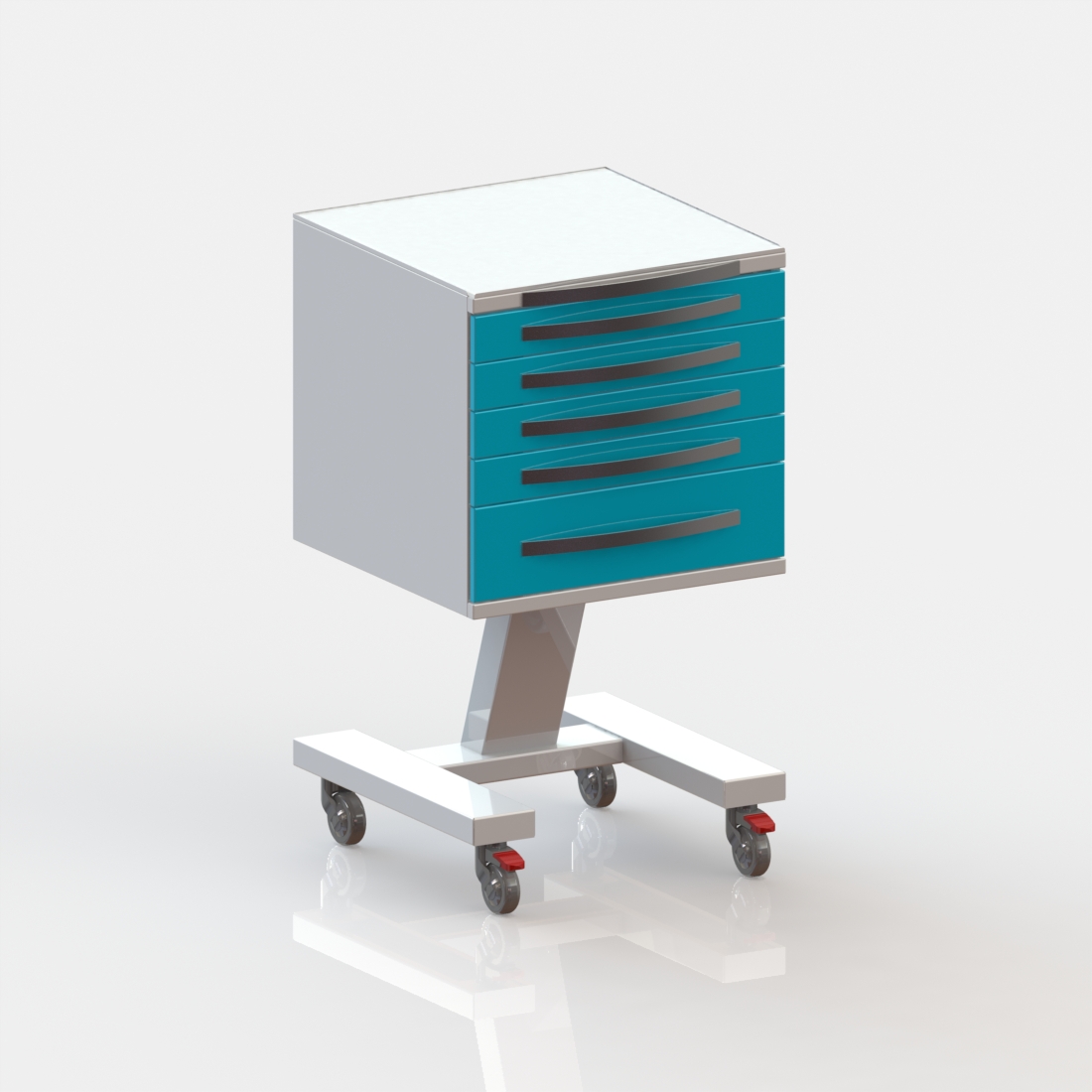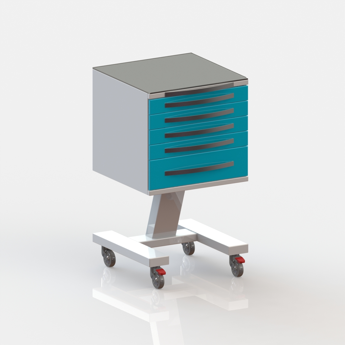 5 выдвижных ящиков. Колёса 50 мм, 2 колеса с тормозом.