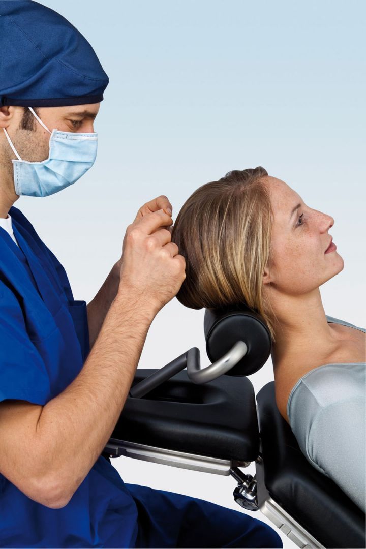 Упор для трансплантации волос с мягкой обивкой обеспечивает оптимальный доступ как к верхней, так и к нижней части головы. Он устанавливается в специальной выемке секции для головы хирургического стола и блокируется. Может регулироваться по высоте.