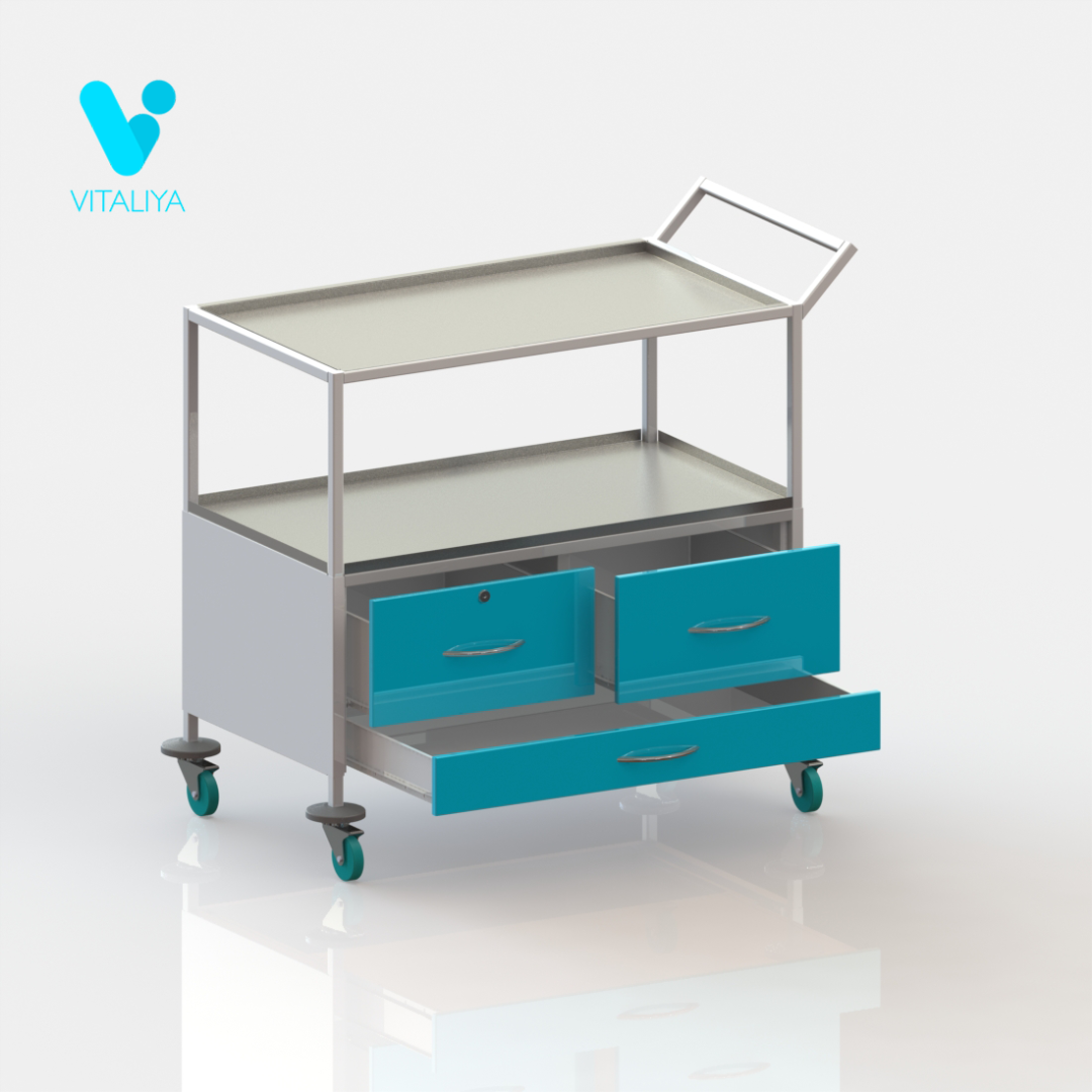 Столик медицинский СММ-04 с тремя ящиками. Каркас выполнен из профильной трубы 20 х 20, корпус из листа холоднокатаной стали толщиной 1 мм. Рабочая поверхность и нижняя полка из нержавеющей стали. Ящики установлены на роликовые направляющие, левый верхний ящик укомплектован замком. На правой стенке ручка для перемещения. Столик установлен на колёсные опоры диаметром 75 мм, два колеса с тормозом.