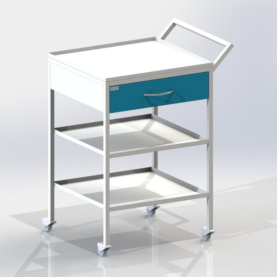Столик инструментальный с 2-мя металлическими полками, с выдвижным ящиком, сбоку ручка. Колесные опоры диаметром 50 мм, два колеса с тормозом. Высота до рабочей поверхности - 810 мм. Есть возможность выбрать любую расцветку по карте цветов RAL. Стандартный цвет мебели - белый 9016.