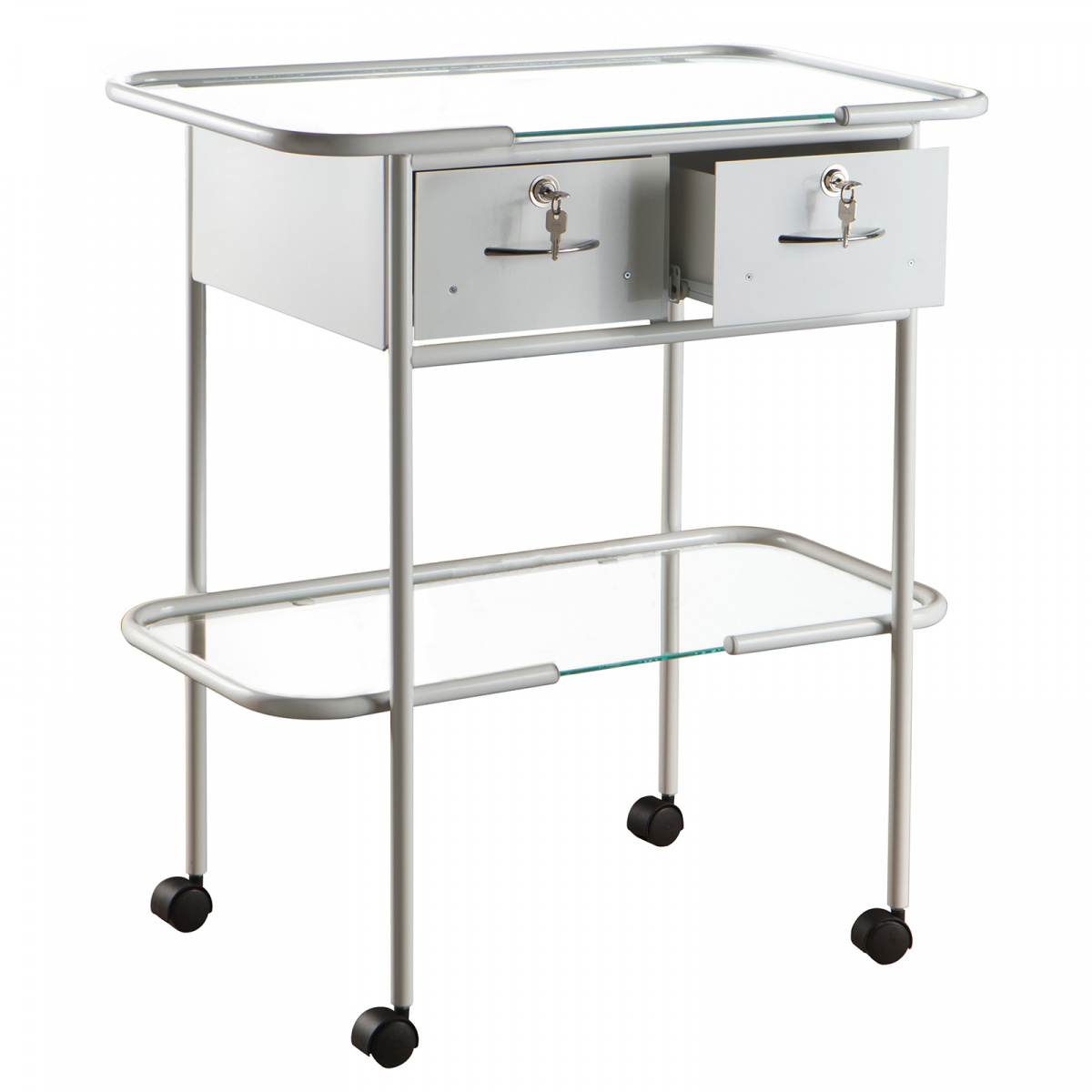 Каркас изделия выполнен из стальной трубы Ø 18. Ящики изготовлены из металла и комплектуются замками. Столик перемещается на 4 поворотных пластиковых колесных опорах, но возможна комплектация колесами из не маркой серой резины Ø 50 мм с тормозом/без тормоза.