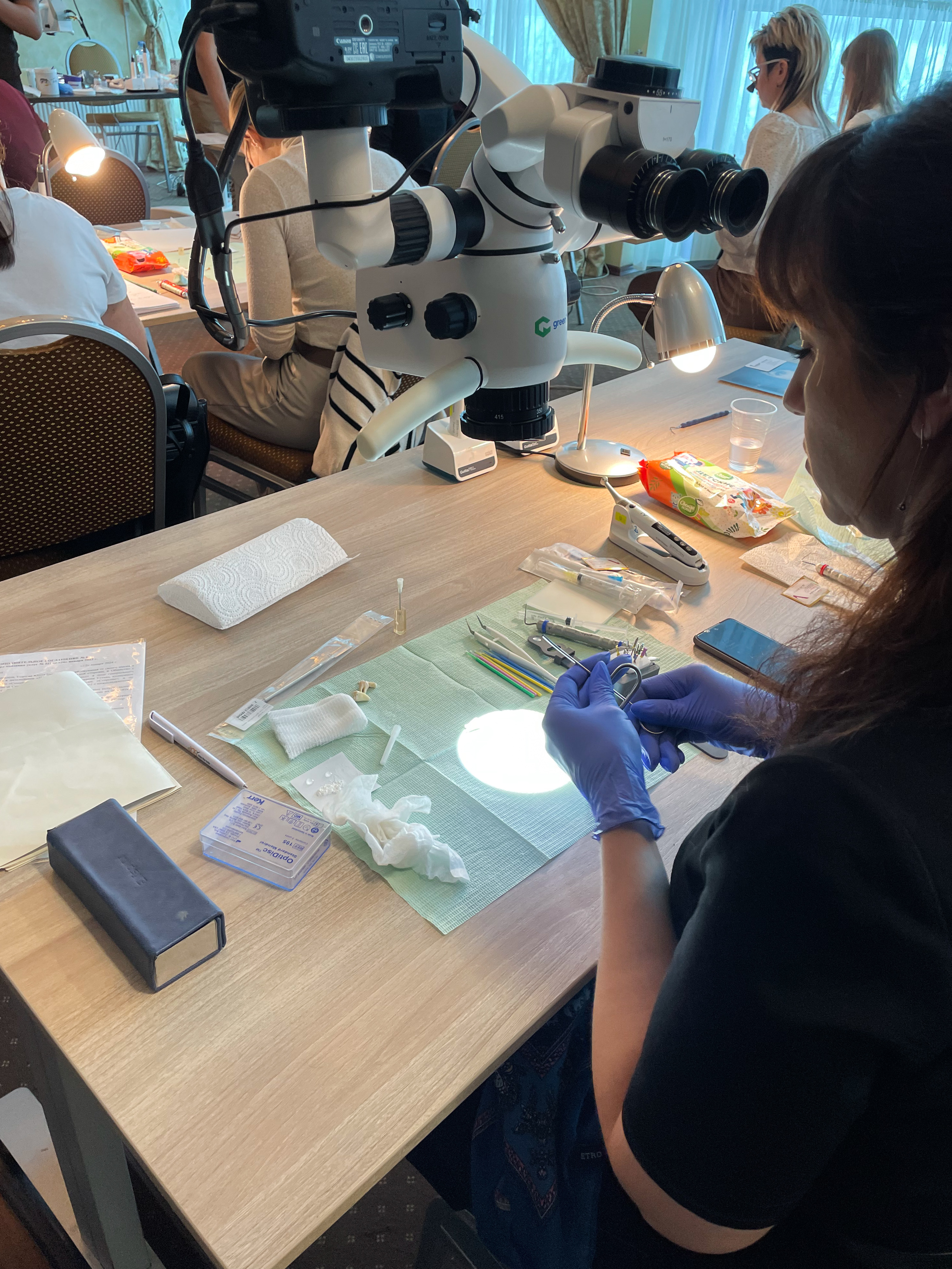 Подробнее об этом рассказывал Алексей Болячин на своём курсе «Перелечивание перелечиваний», а его участники отрабатывали полученные навыки на микроскопах компании GREEN DENT.
